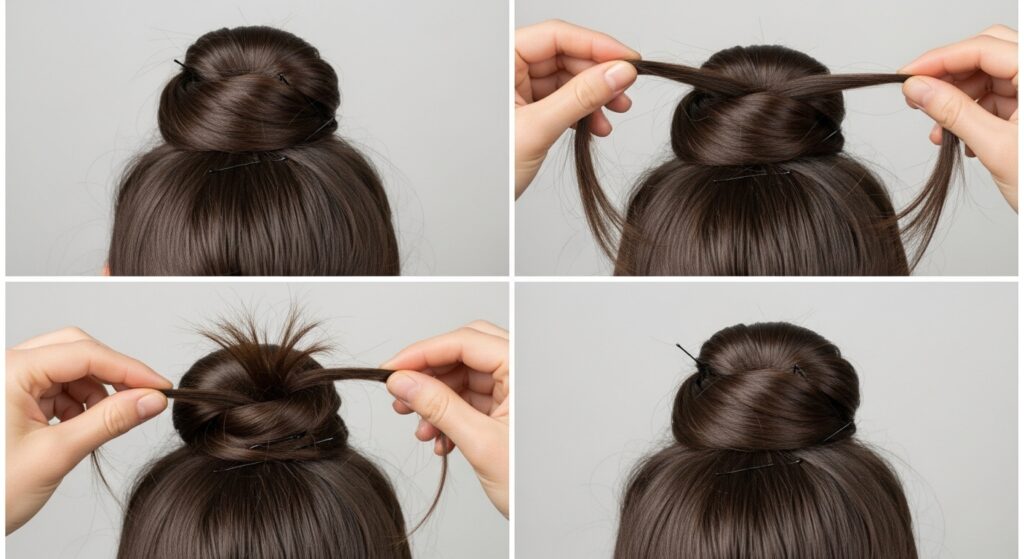 After creating your basic angled bun, take a small section of hair from the tail end and wrap it around the base of the bun, pinning it securely underneath. This creates a clean, finished look that hides pins and adds a professional touch. For variation, you can leave the tail out for a small, decorative flick.