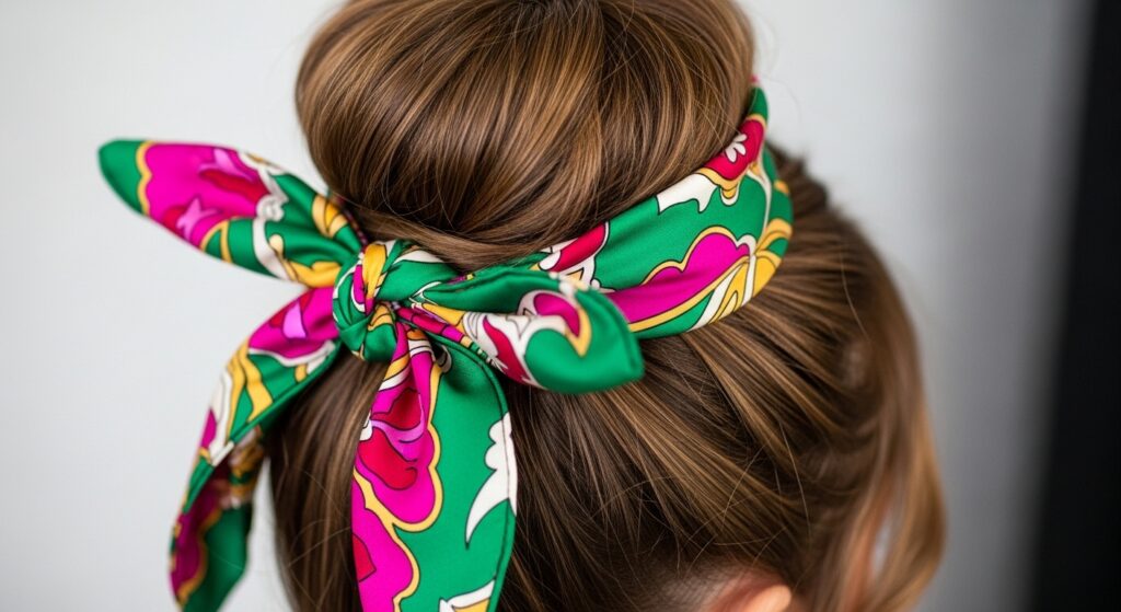 A silk or satin scarf is a versatile tool. You can tie it around your head like a headband, letting the ends blend into the updo. You can also use it to tie the bun itself, creating a large, soft bow or knot. The patterns and colors on a scarf can completely change the mood of your hairstyle.