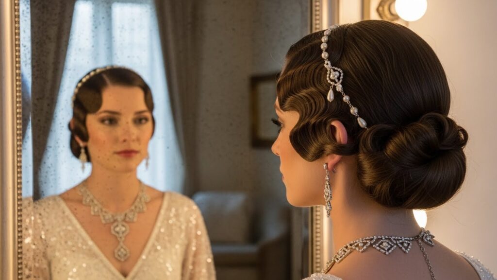 The 1920s Finger Wave Updo: Sleek, sculpted waves are pressed close to the head, often leading into a low bun or chignon at the nape. It’s the ultimate Great Gatsby-inspired look.