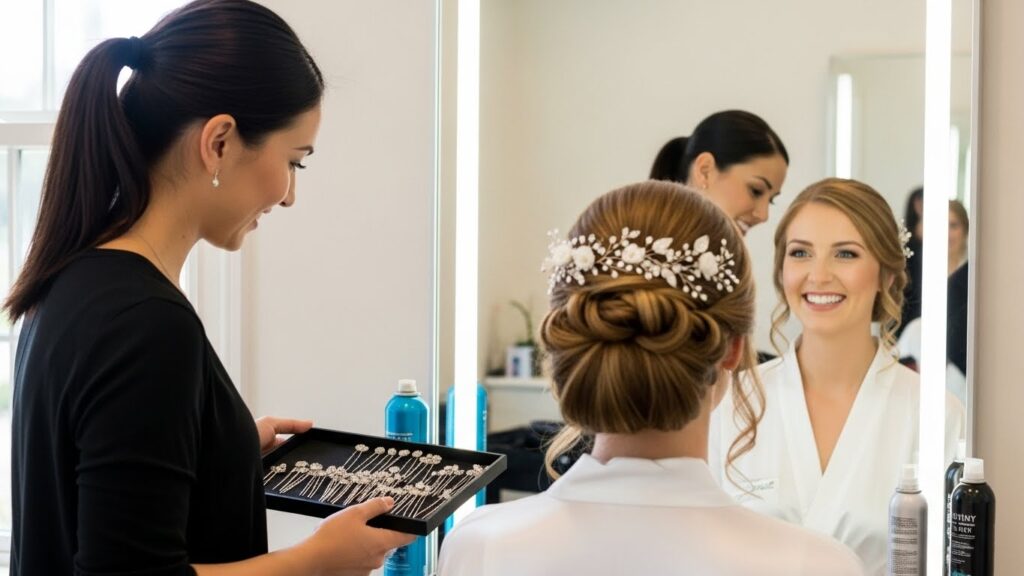 Plan for Longevity: Use professional-quality products and consider light teasing or backcombing at the crown for volume that lasts. Your stylist will use plenty of pins and likely a firm-hold hairspray to ensure your updo survives every hug and dance.