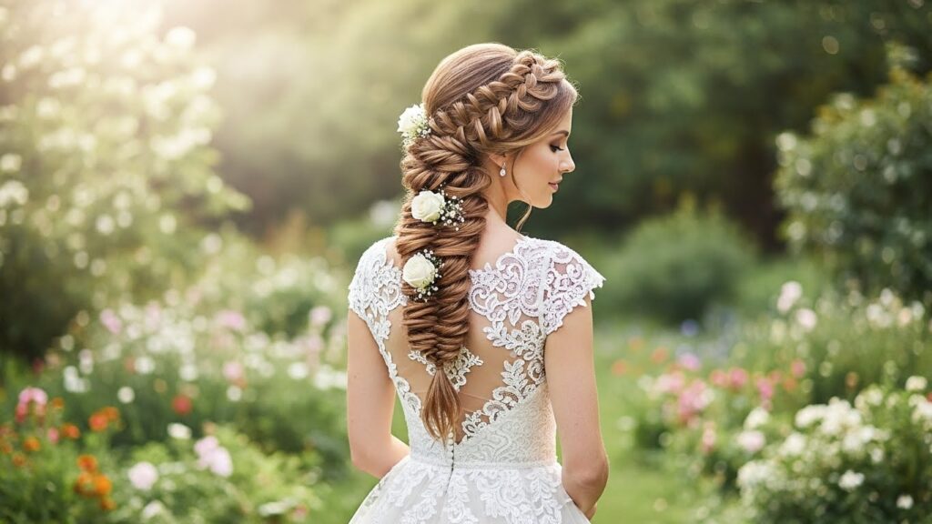 The Braided Crown: A halo of braids encircling the head, creating a fairy-tale, goddess-like effect. It can be done with a single thick braid or multiple smaller ones, often intertwined with baby’s breath or small flowers.