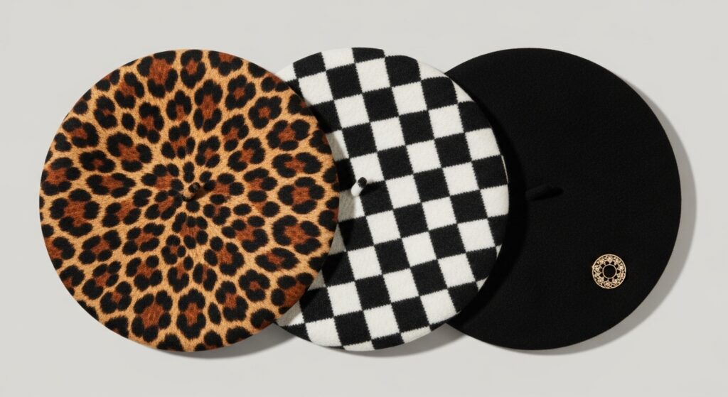 14. The Animal Print Beret: A leopard or snakeskin print beret is a fierce and fashionable choice. The key is to let it be the sole wild element—pair it with minimalist, solid-color outfits.