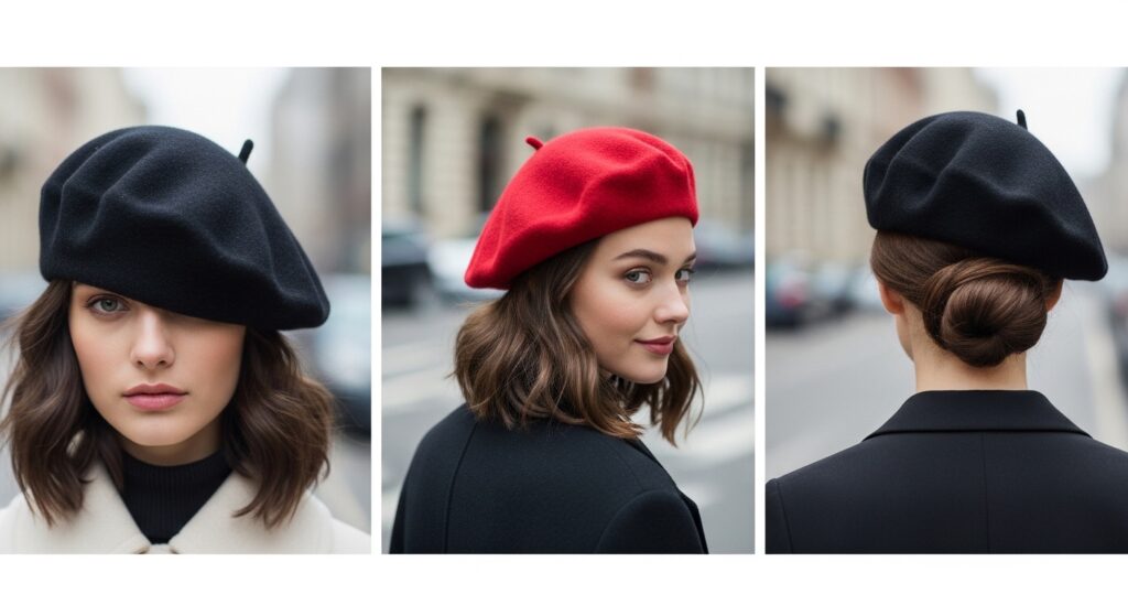 1. The Classic Black Wool Beret: The undisputed queen. In dense, felted wool, this beret is for life. It pairs perfectly with a trench coat, a little black dress, or even denim and a leather jacket. Its power is in its versatility and stark elegance.