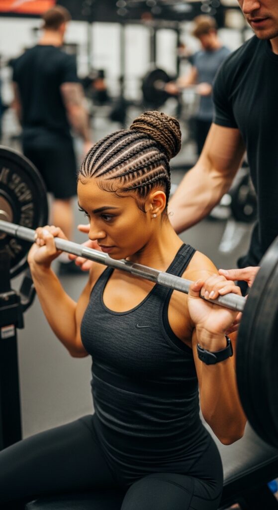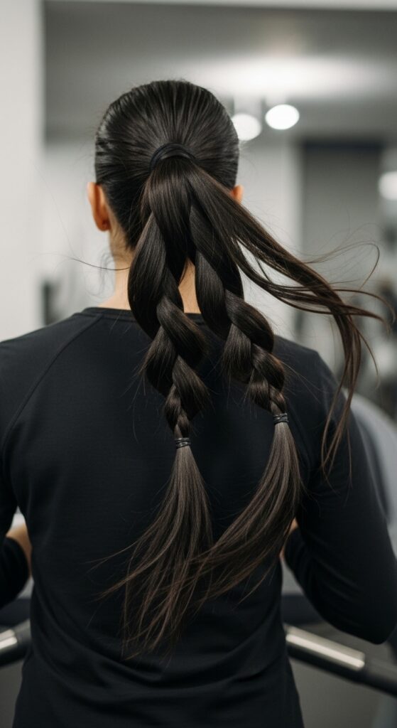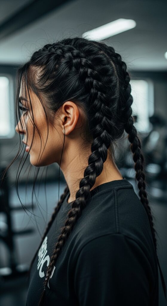 This one screams “I’m serious about this workout.” Part your hair down the middle, then Dutch-braid both sides going backward toward the nape. Braid all the way down and secure with elastics. They stay tight through sweat and movement.