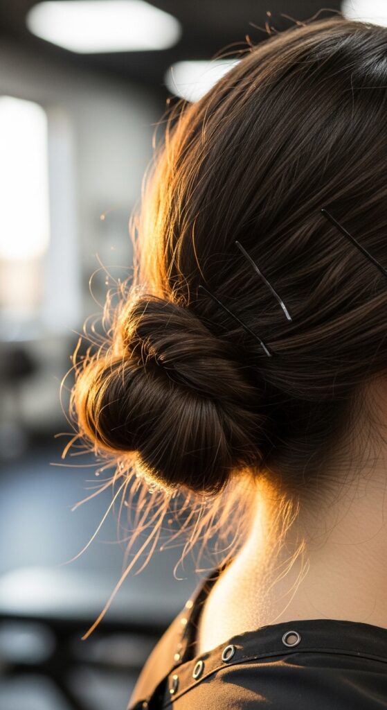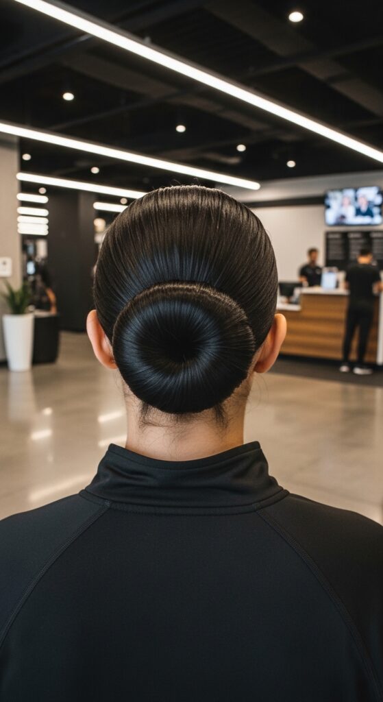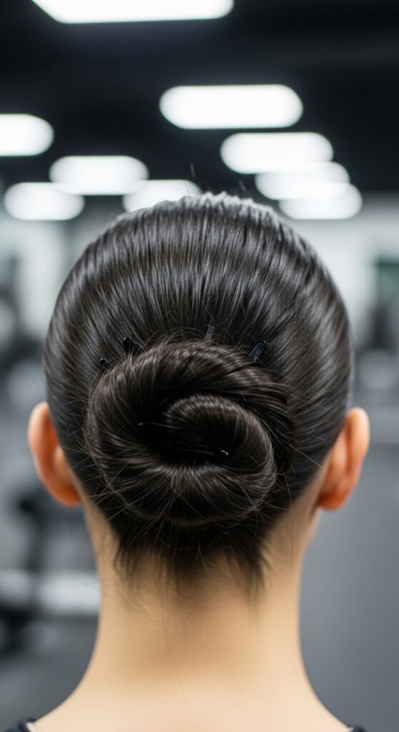 Use a donut sock bun maker for a perfectly round, tight bun. Slide it over your ponytail, roll down, and tuck ends. Secure with pins. It doesn’t budge during any activity.