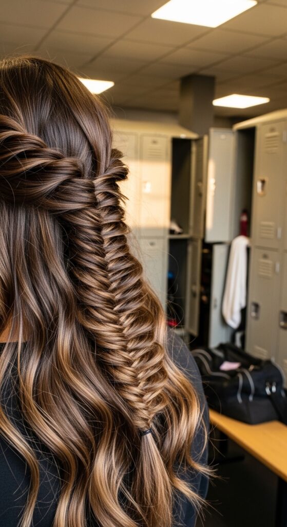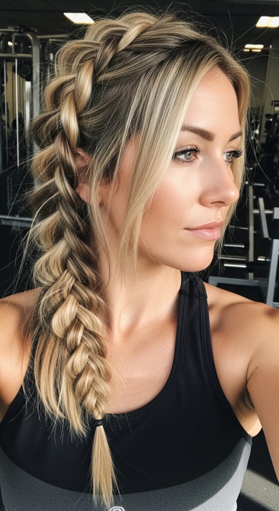 Start with a deep side part, then French-braid tightly from the temple down to your ends. Secure with a small clear elastic, then tug the braid slightly to loosen the strands for volume. This style holds through hiit workouts and spin classes.