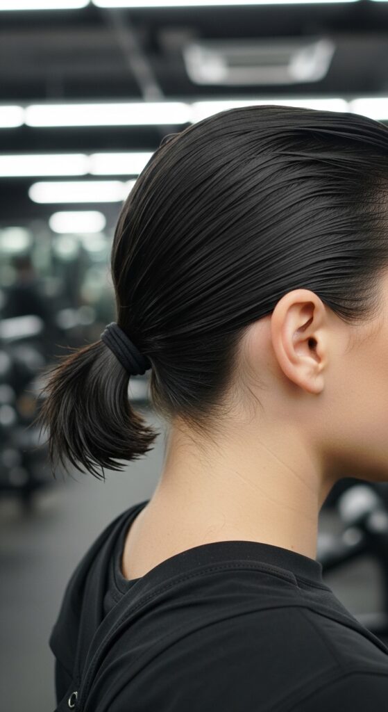 Gel your roots back, comb into a low ponytail at the nape, and secure tightly. Use a fine-tooth comb for a polished finish. This is the ultimate “no-nonsense” gym hair.