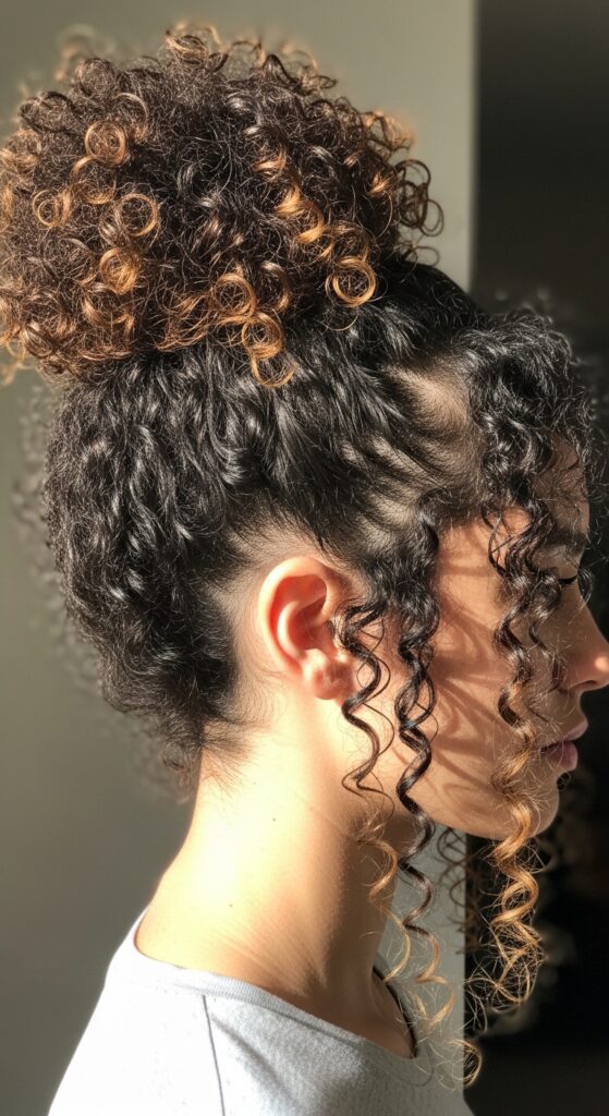 If you have curly hair, don’t fight the texture. Gather your curls into a high, loose bun at the crown, leaving a few curls out around your face. Use a silk or velvet scrunchie to protect your curls—it stays put and keeps your shape.
