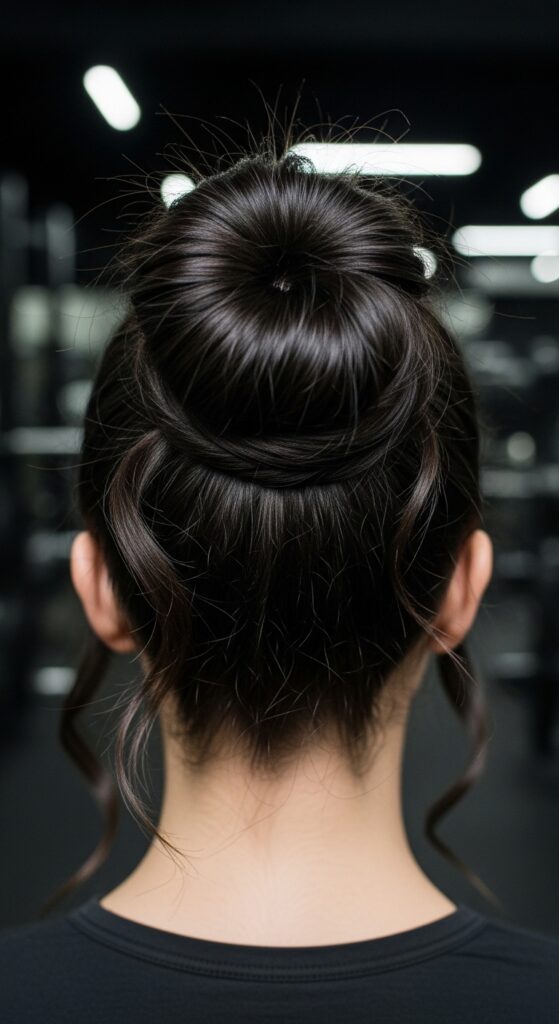 I use a spiral elastic for extra grip. This bun works for every workout type, from lifting to running. It’s a practical take on glitchy glam hair—imperfect but intentional, with texture that never looks sloppy.
