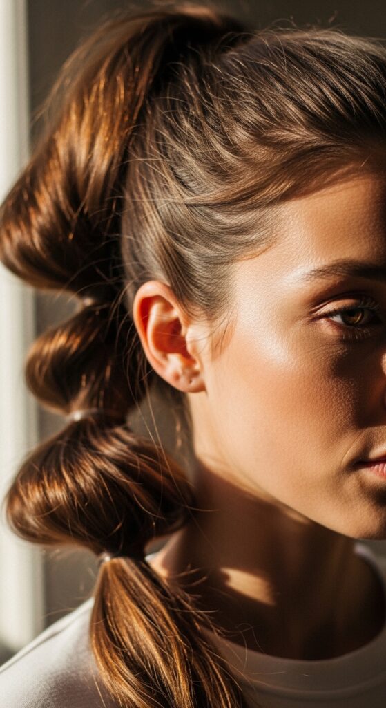 High ponytails are great for thin hair if you know the trick. Use a small hair donut (or a sock) to create a bubble at the base. Wrap your hair around it and secure with a second elastic. This gives you a thick, full ponytail instantly.