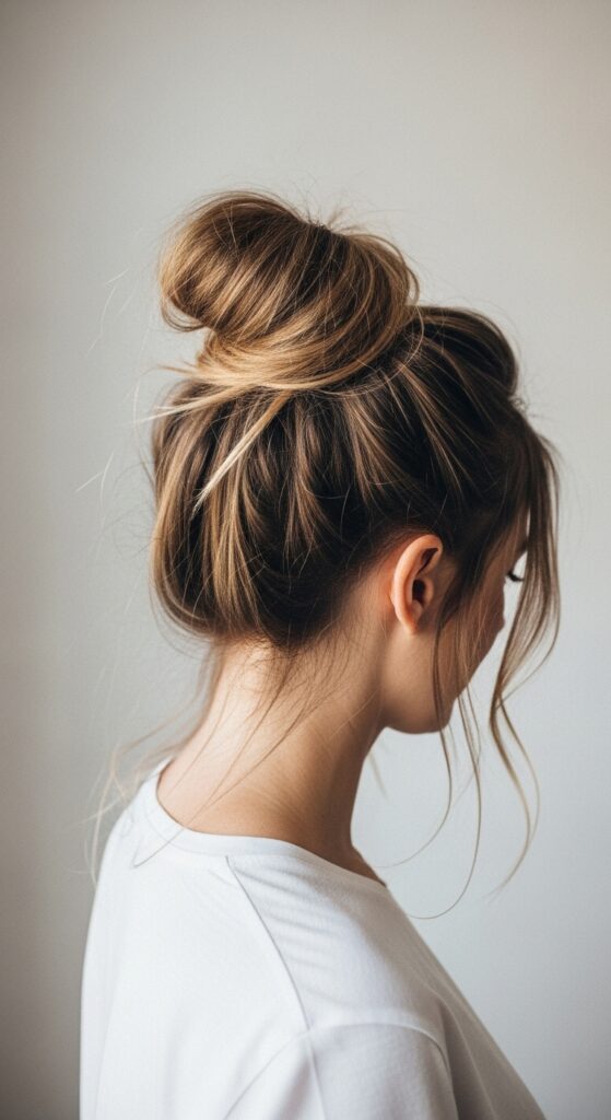 A messy bun can be your best friend if you do it right. The trick is to tease the hair before pulling it up. Then, use your fingers to pull out a few strands for softness. The texture from the teasing gives the bun real body.