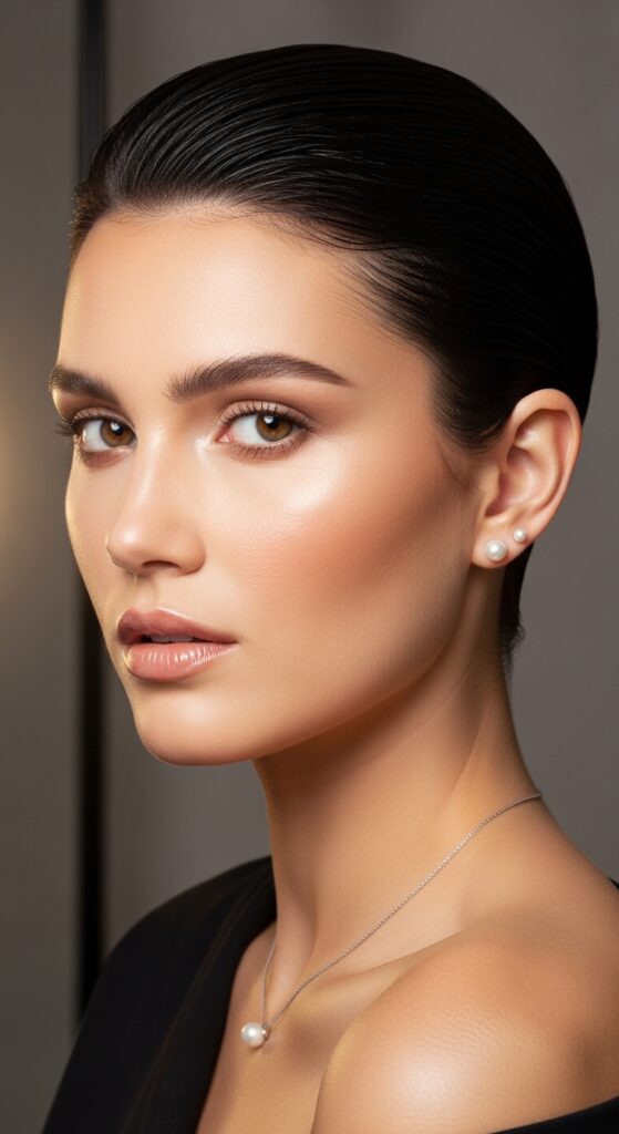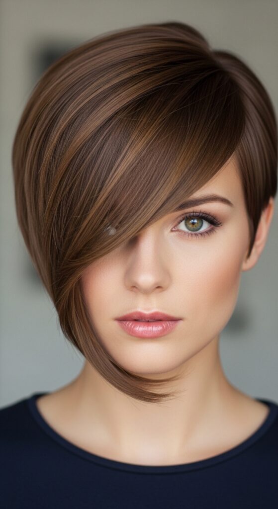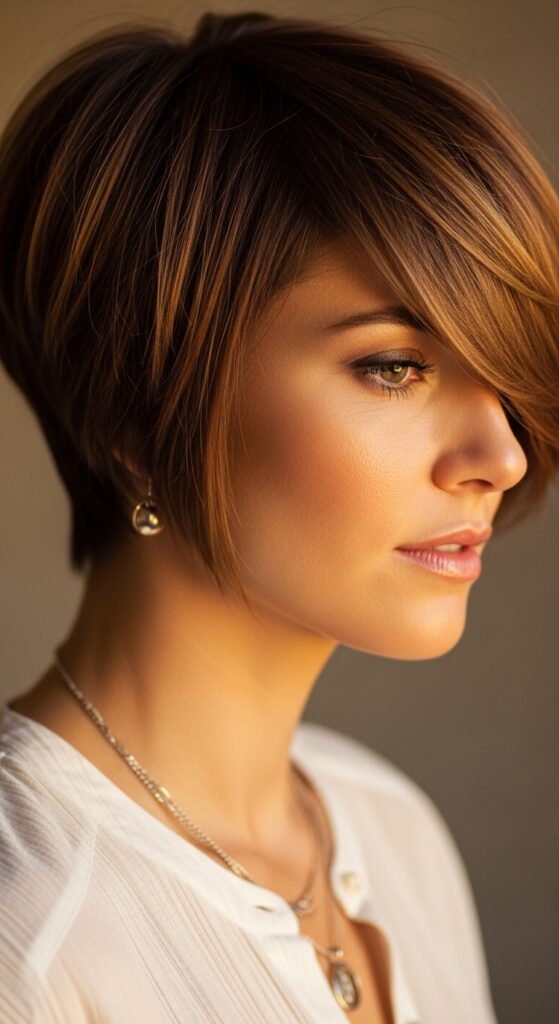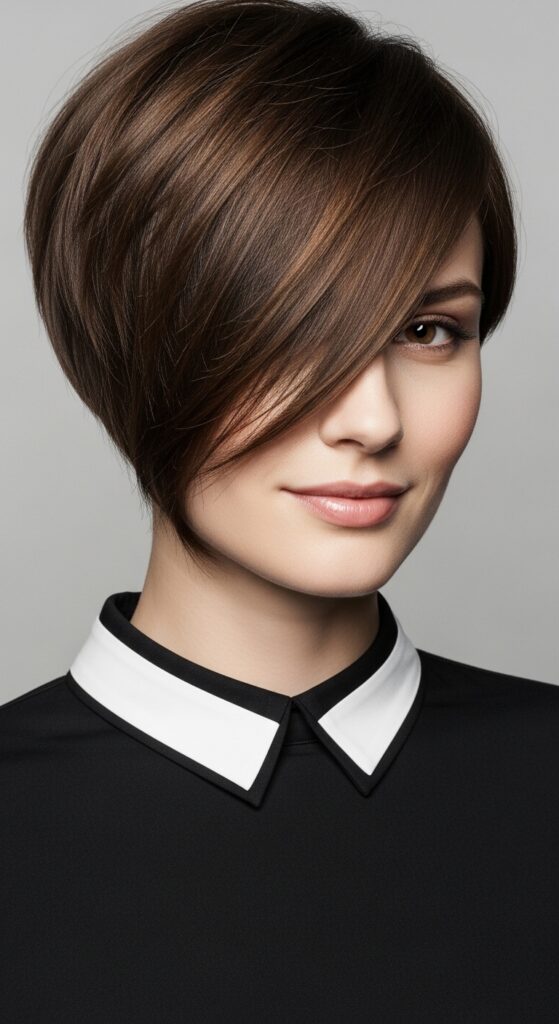 Think of this as the quiet luxury bob but in pixie form. It’s all about smooth, shiny hair that sits close to the head with a defined side part. The polish of this cut instantly makes you look put-together, and the sleekness keeps your face from looking too soft or round.