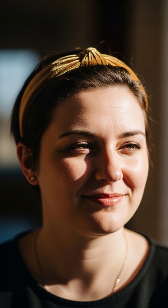 Accessories are your shortcut to a new look. A headband or a small clip can add height on top, which slims the face. This is a great way to refresh your pixie between trims. Choose a velvet headband for that old money hair look.