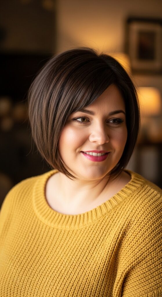 If you have an event or just want to feel fancy, this is your cut. The volume at the crown and the soft curl at the ends create a rounded shape that balances width. It’s a little retro glam, a little quiet luxury bob energy.