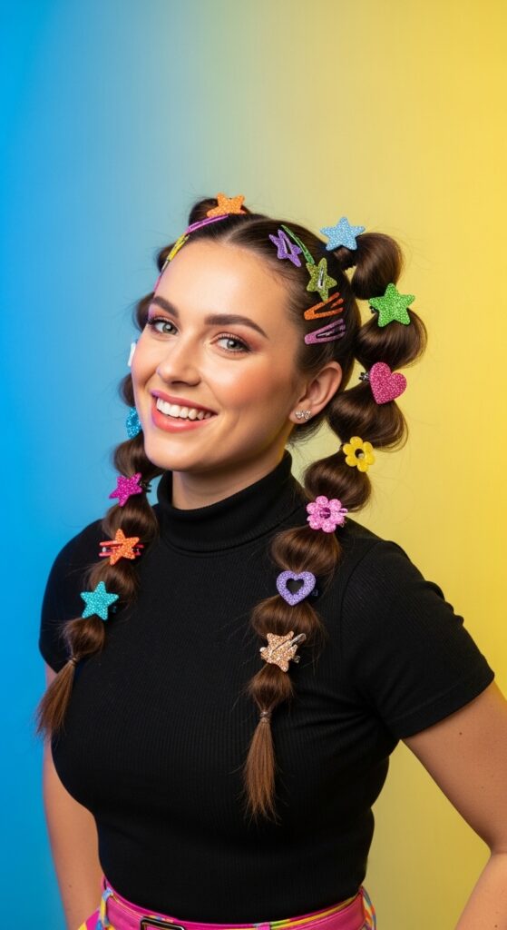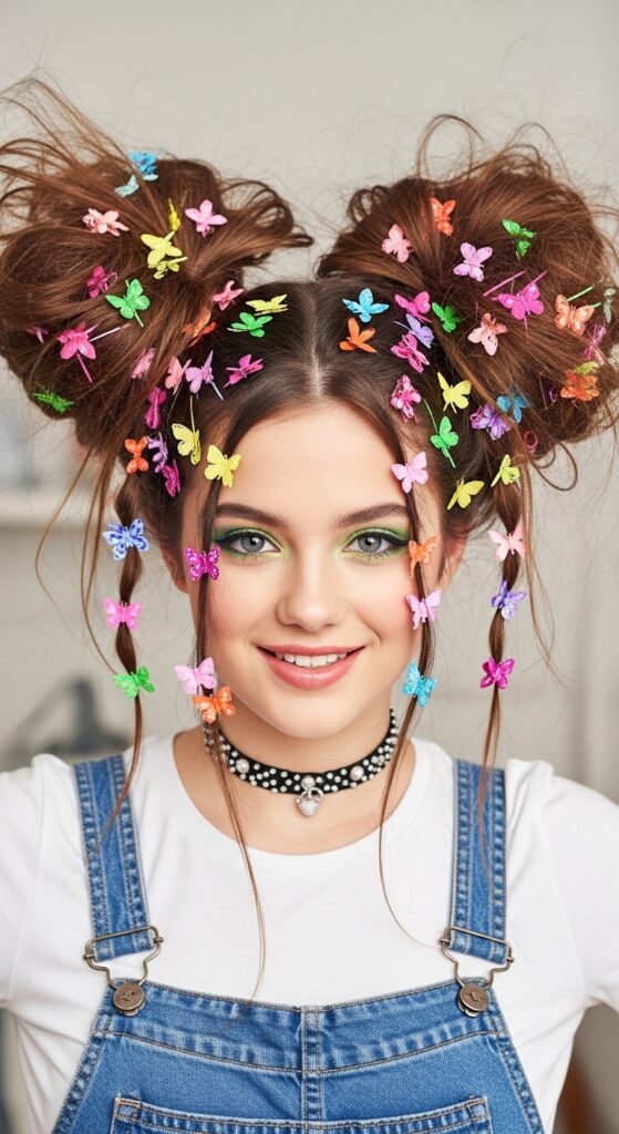 After creating high ponytails, lightly tease the hair at the crown. Then, add your clips—think pearls, butterflies, or colorful barrettes. There are no rules here.