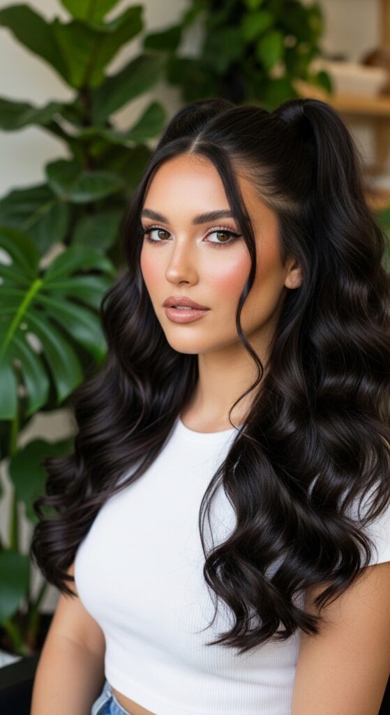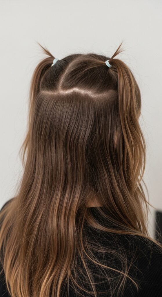 Want the playful feel but not ready to commit to full pigtails? The half-up version is your answer. It gives you the best of both worlds: style and hair-down comfort.