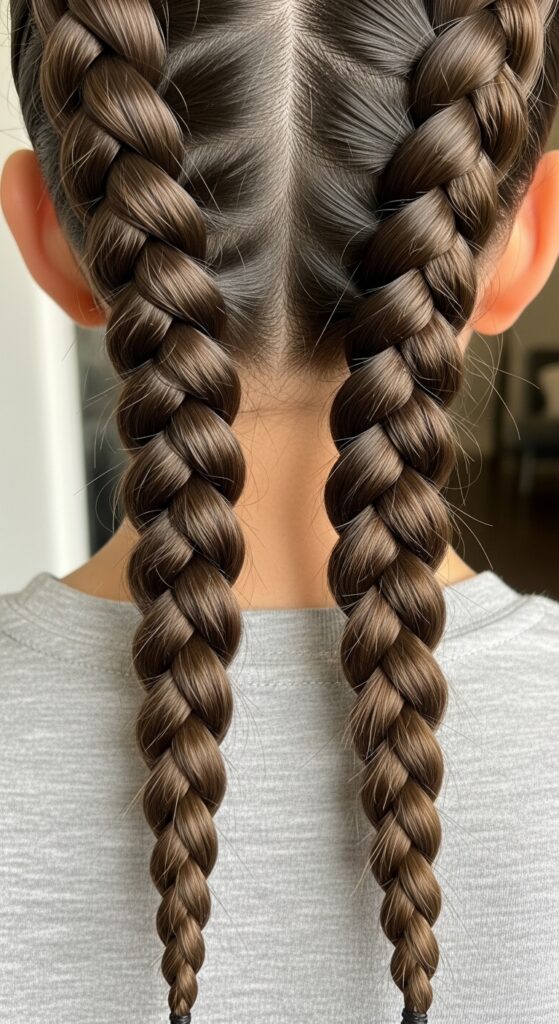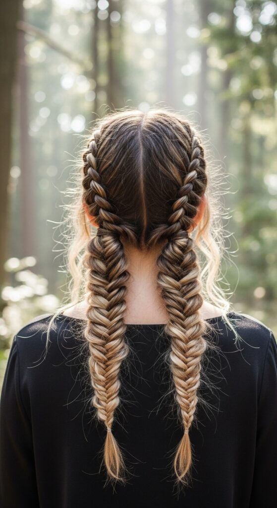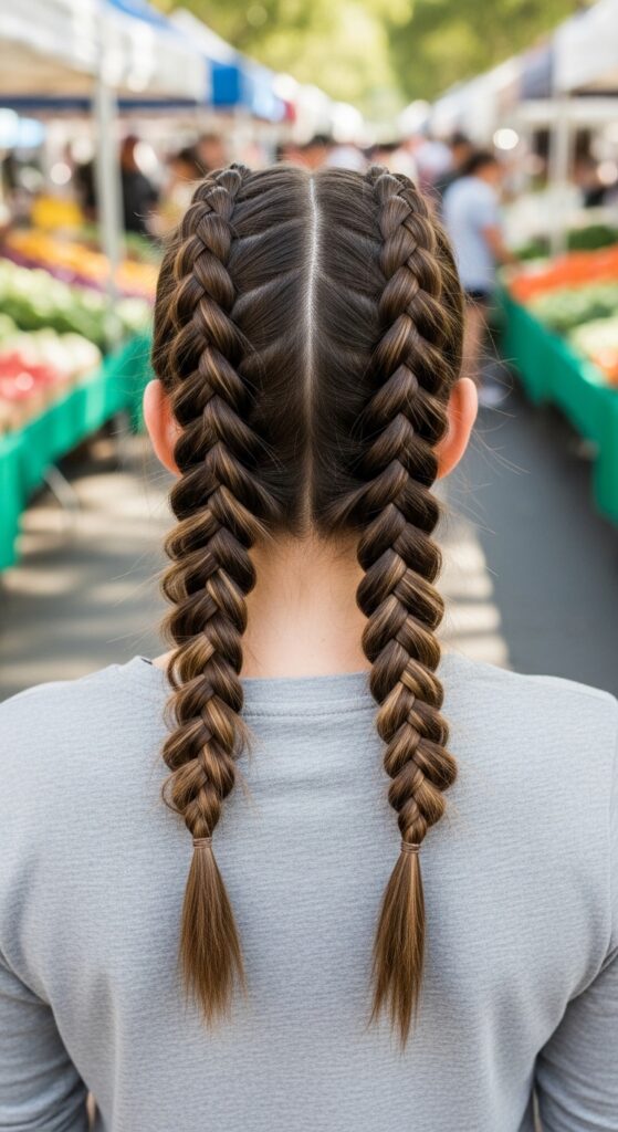 Create two Dutch or French braids starting at your hairline. Braid them all the way down and secure the ends with elastics into pigtails. You can make them tight or intentionally loose and messy.