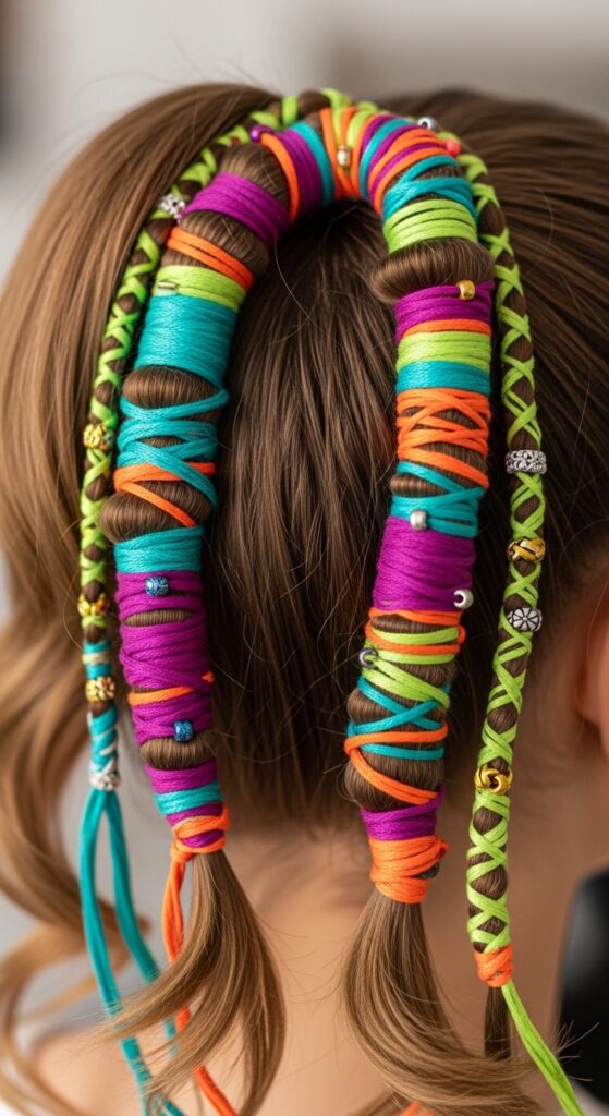 Make two low ponytails. Take your chosen cord and wrap it tightly around the base of the ponytail, securing the end with a bobby pin. You can also weave it through the hair for a more complex look.