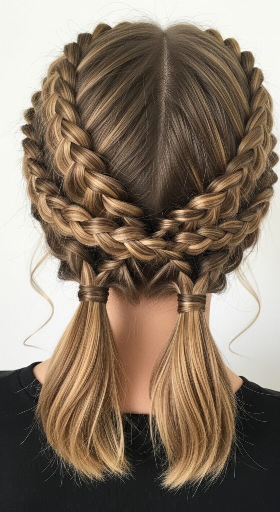 Create two braids (any style) starting at your temples. Instead of pinning them across the top, bring them to the back of your head and secure the ends into two low pigtails.