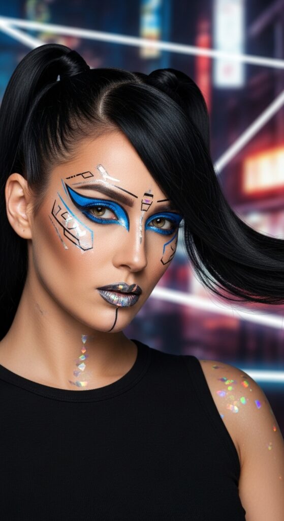 Glitchy glam is all about intentional imperfection—like a digital glitch. Apply that to hair by making your pigtails look slightly “off.” Pull out a strategic section or secure one pony with only half the hair.