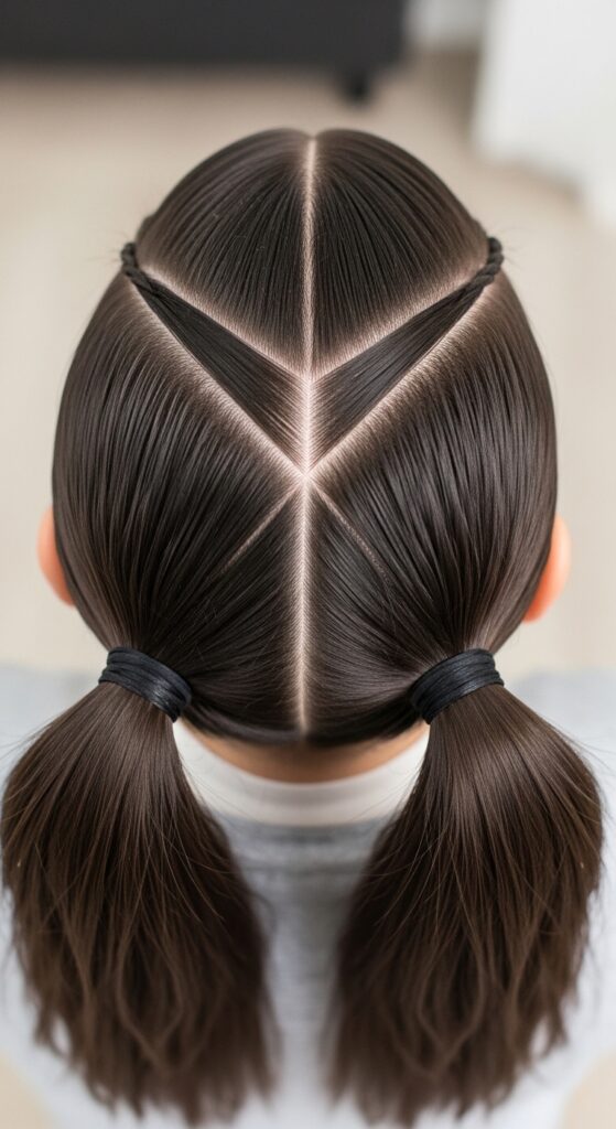 Use the end of a comb to draw your chosen pattern on your scalp. Follow the part lines to section your hair. Then, gather into ponytails as usual. The unique part does all the work.