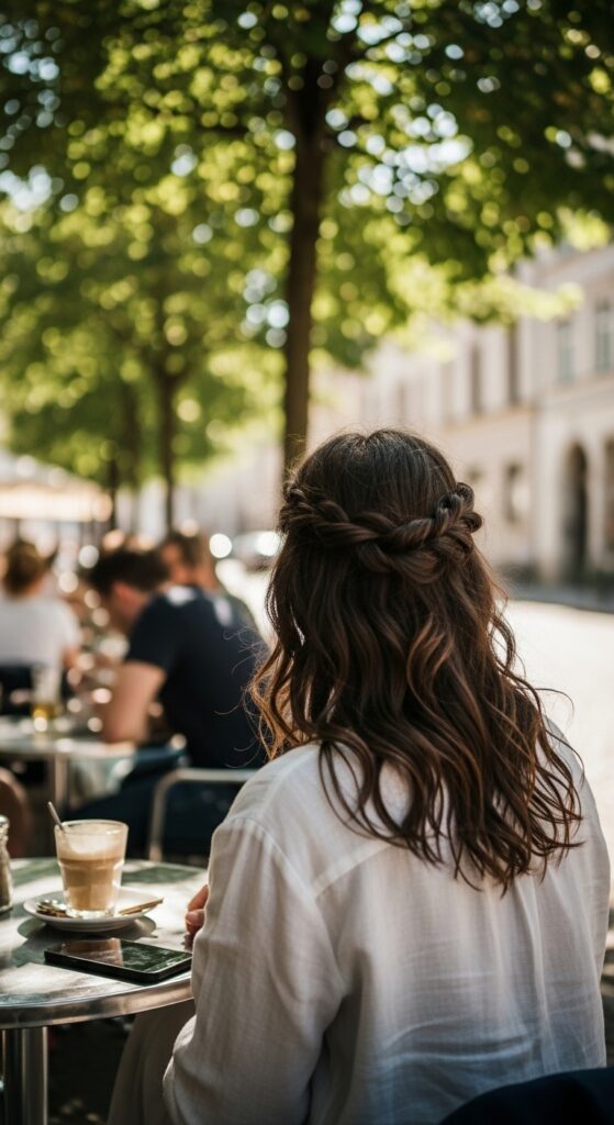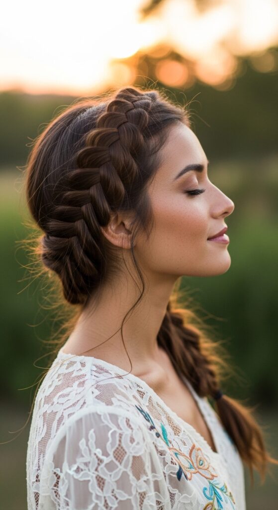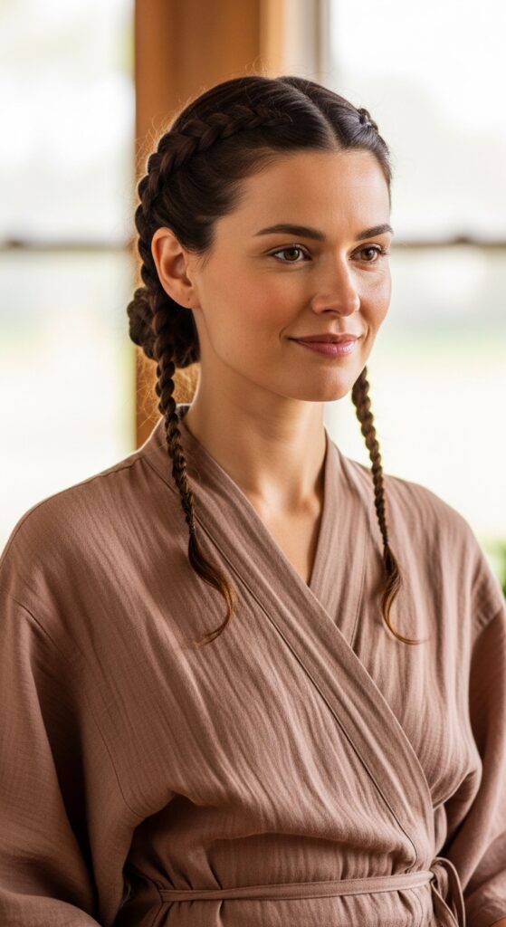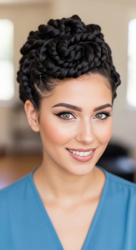 Then, wrap them across the crown of your head like a crown, pinning securely. Leave some tendrils loose around your face. It’s protective, dramatic, and keeps hair completely off your face and shoulders.