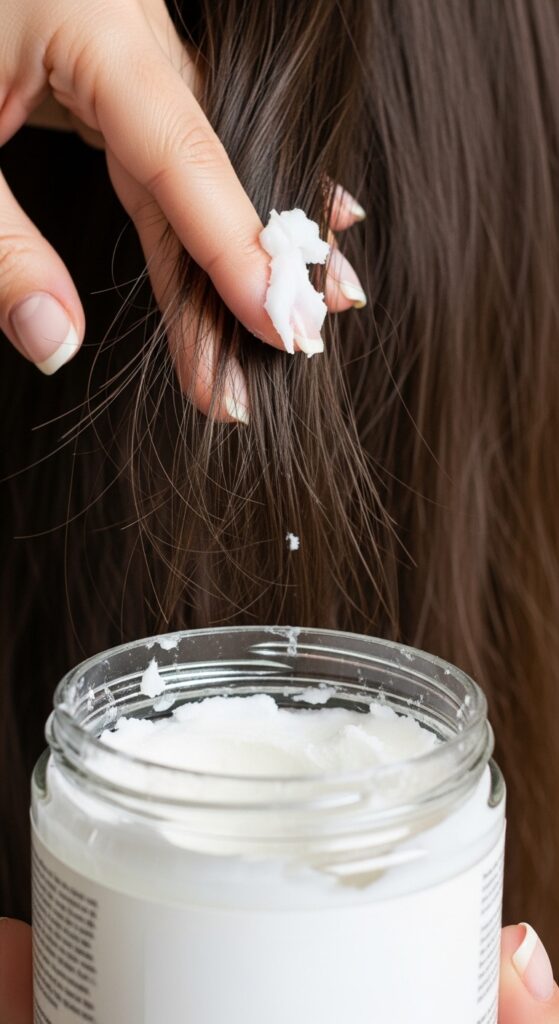 - Apply a lightweight oil (like coconut or avocado) or a thick conditioner to dry hair.