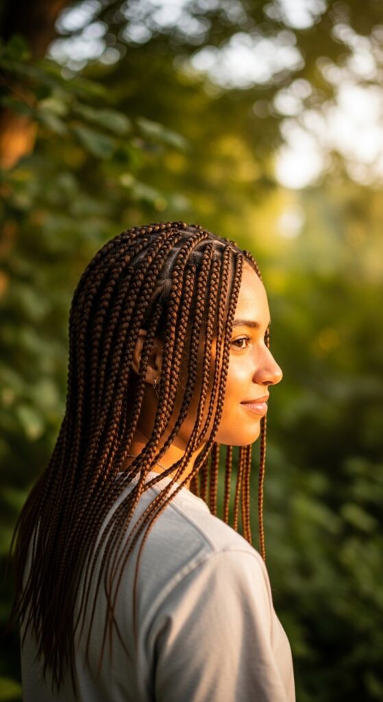 Use a light leave-in conditioner and a moisturizing braiding gel. Keep the braids a comfortable size—not too tight at the roots. This style can last weeks, giving your natural hair a full rest.