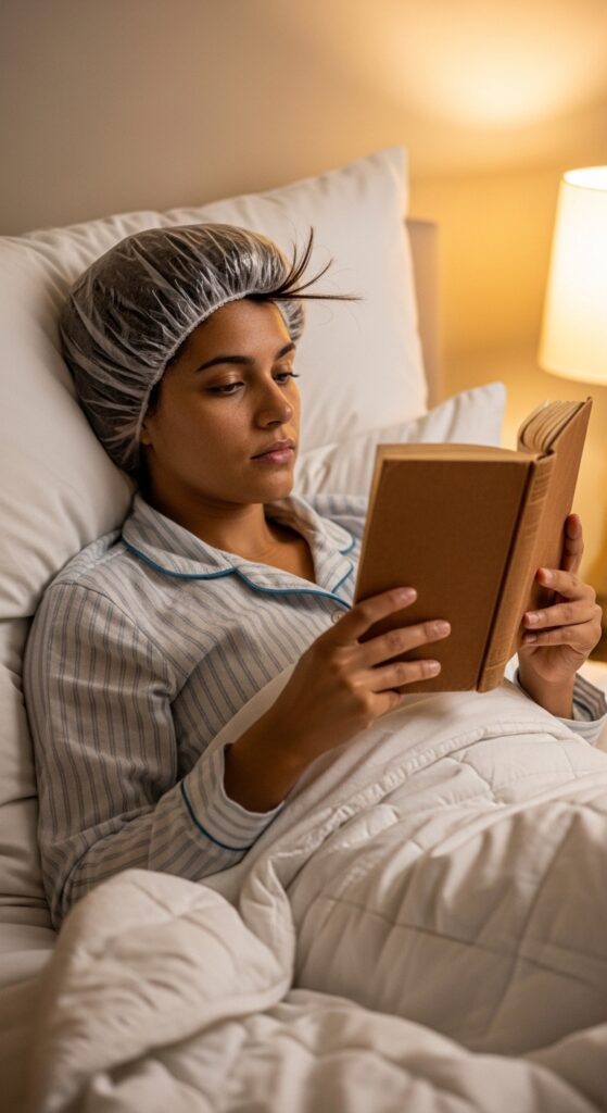 Braid or twist your hair loosely, then wrap it all in a plastic cap or use a dedicated conditioning cap. Sleep on it! Rinse in the morning for hair that feels like silk.
