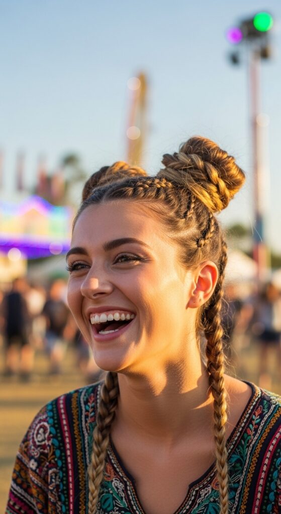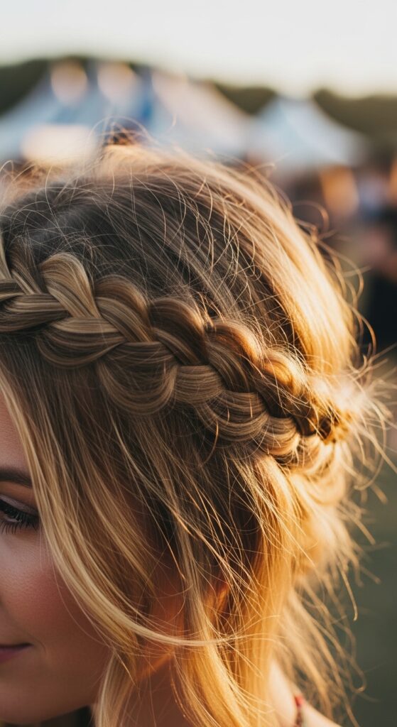Want a festival-ready look without the headache? Create two Dutch braids along your hairline, meeting at the nape of your neck. Then, simply pin them across your head like a crown.