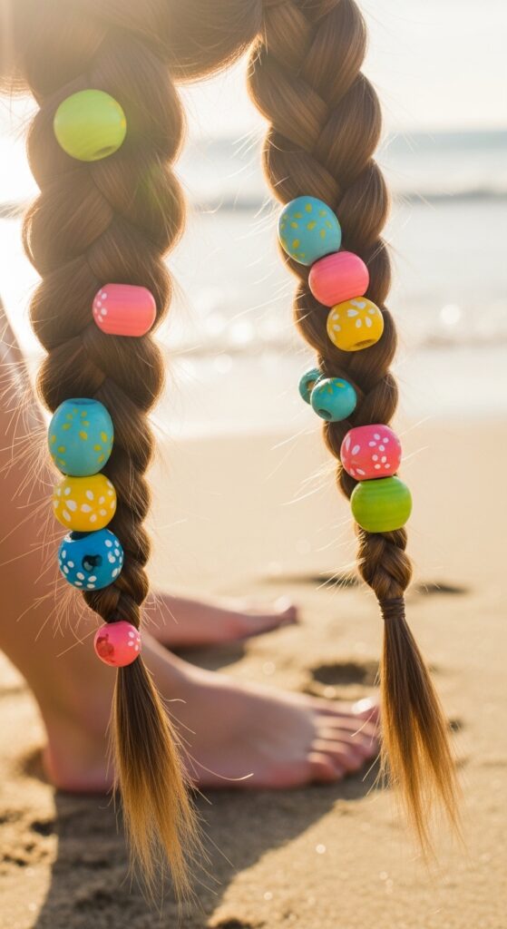 After creating your Dutch braid pigtails, add some summer flair. Thread small, colorful beads onto the ends of your braids and secure them.