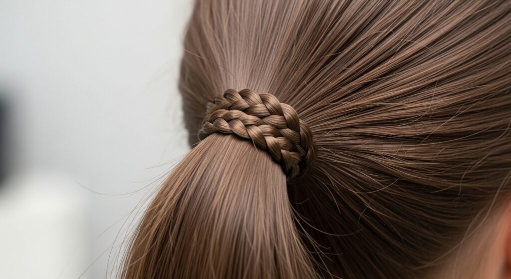 Elevate a simple Dutch braid ponytail with an elegant finishing touch. After creating your ponytail, take a small section of hair from underneath the ponytail, wrap it around the hair elastic to conceal it, and secure it with a bobby pin. For an extra braided detail, you can use the tail end of one of your Dutch braids to perform the wrap. This adds a custom, salon-quality finish that transforms a basic secure style into a refined look, perfect for the athlete who goes straight from training to meetings.