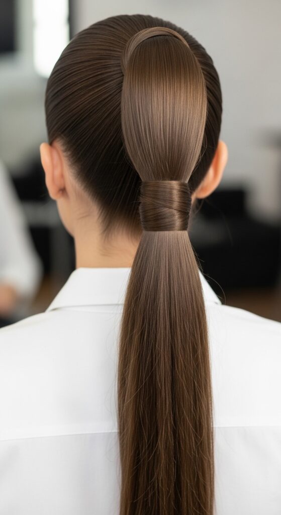 - Take a small piece of hair from the ponytail and wrap it around the base to hide the elastic.