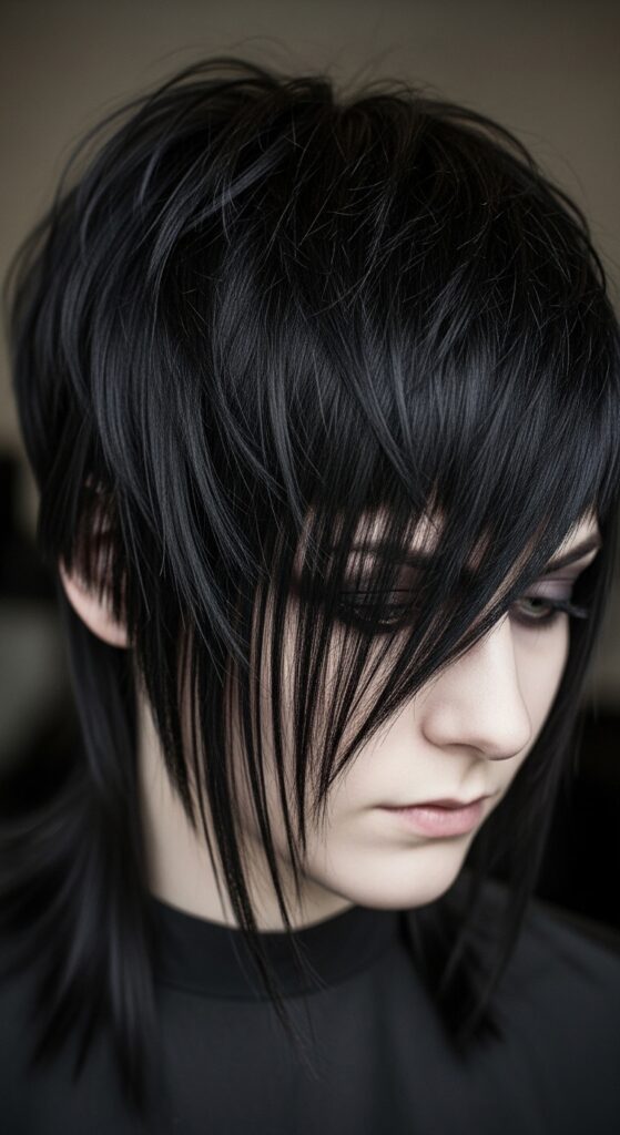 Style with a matte texturizing paste worked through the ends. Embrace the piece-y, slightly undone look. It’s a bold take on romantic goth hairstyles that’s very now.