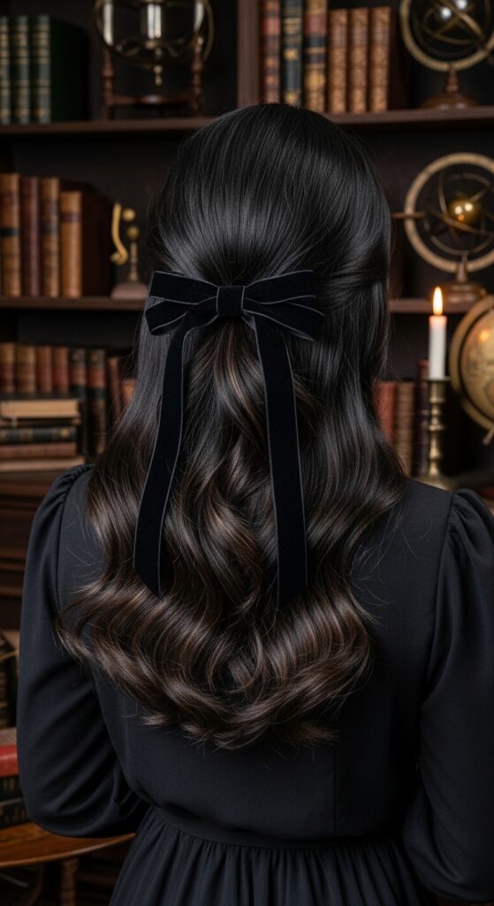 Back-comb gently at the crown for a subtle lift. Finish with a flexible-hold hairspray to keep the waves soft and touchable. Add a velvet ribbon or a delicate hairpin for that final storybook touch.