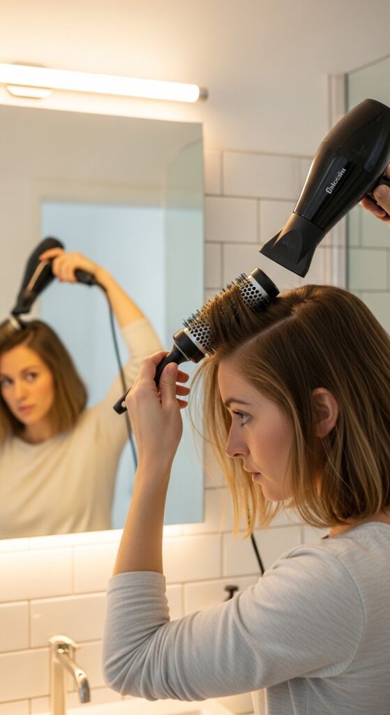 - Direct the blow-dryer nozzle down onto the root area while lifting with the brush.