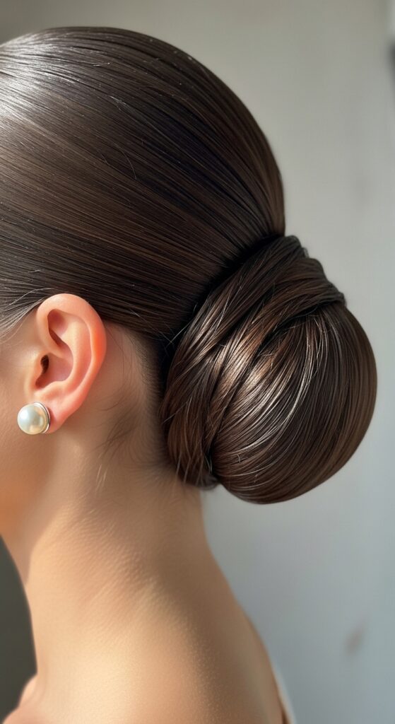 Apply a smoothing serum or light gel to damp hair and blow-dry straight. Gather a low ponytail and twist it into a tight, neat bun at the nape of your neck.