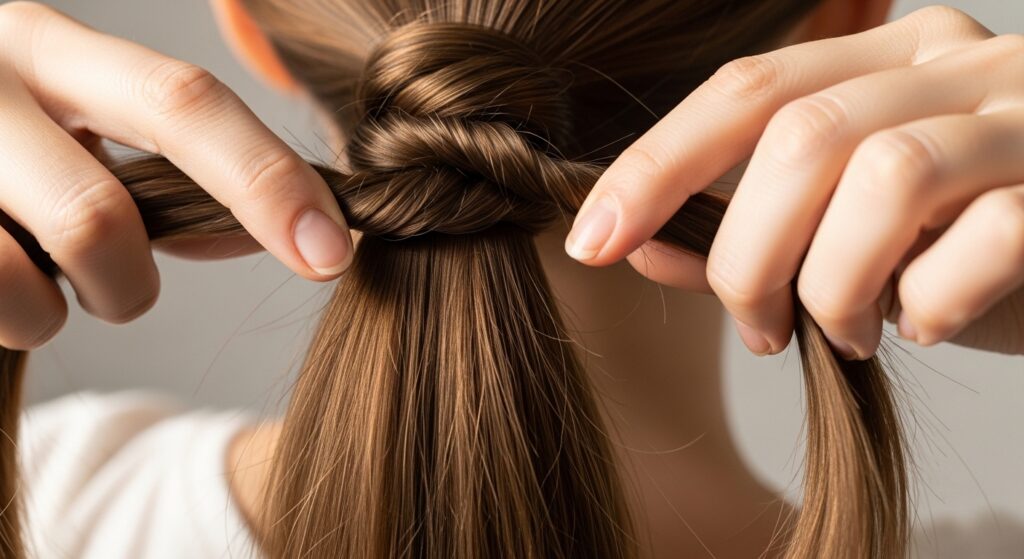 13. The Double-Knot Bun: Split your hair into two sections, tie them in a simple knot, then tie them again. Tuck the ends under and pin. It’s quick, secure, and has beautiful, natural texture.