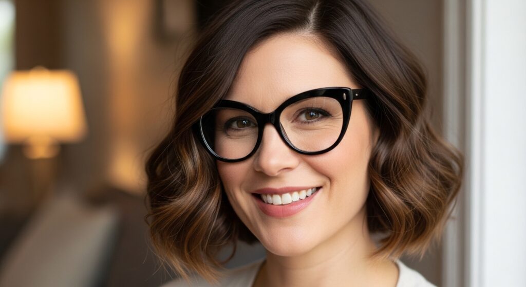 10. The Textured Wob (Wavy Bob): Add loose waves to a lob for a relaxed, beachy feel. The waves break up the hairline softly, preventing any harsh competition with your glasses.