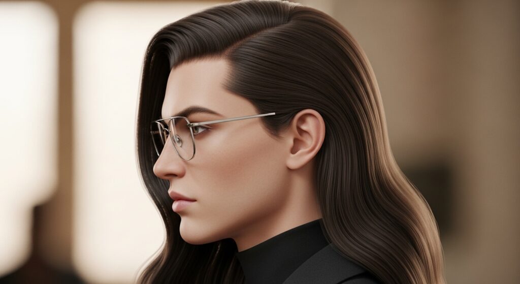 13. A Deep Side Part with Sleek Hair: Smooth, straight hair with a deep side part is sophisticated and graphic. It creates a long, clean line that complements angular or geometric frames perfectly.