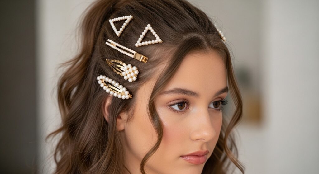 This style is a playground for accessories. Pull the top section of your hair back, but instead of a simple elastic, decorate it with statement clips, pearls, or colorful barrettes. It’s a sweet, trendy, and highly customizable look that lets you match your hair to your outfit or mood. Perfect for a day at school or a hangout with friends.