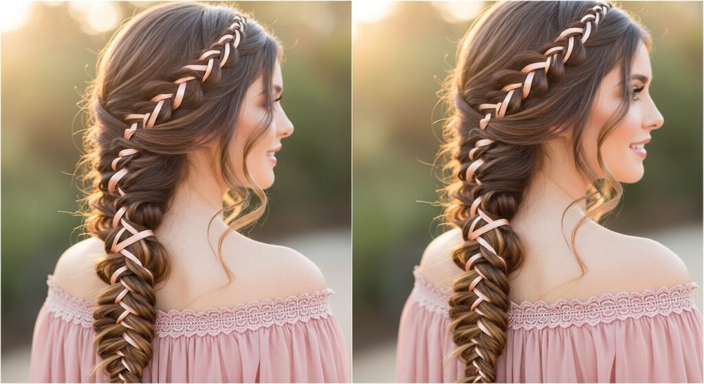 Pull-Through Braid with Ribbon: Weave a delicate ribbon through a pull-through braid (also known as a cascade braid) for a pop of color that matches your dress or accessories. It’s feminine, festive, and unique.