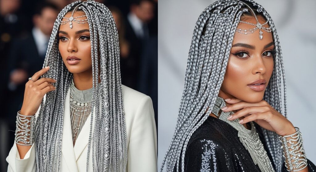 Think sleek, medium-sized goddess braids in a pure, mirror-like silver. This look is cool, futuristic, and incredibly elegant. It pairs beautifully with monochromatic outfits and makes a stunning statement for evening events.