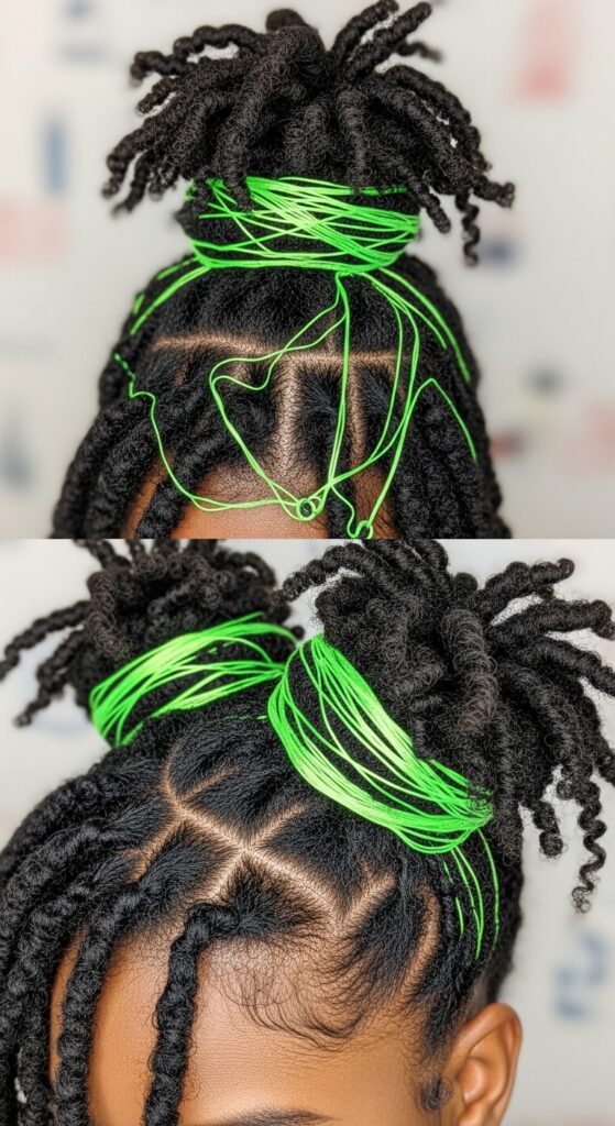 Do one big and one small. Leave out chunky pieces of curls. Wrap a neon thread around the base. Add tiny silver charms. It’s a fun, protective style that shows off your personality.