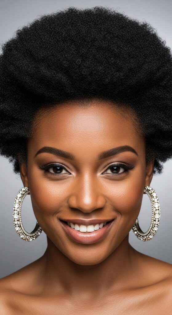 Define your curls with a foam, or rock a picked-out fro. Add bold earrings or a headwrap. This style is all about embracing your beautiful face and your hair’s journey.