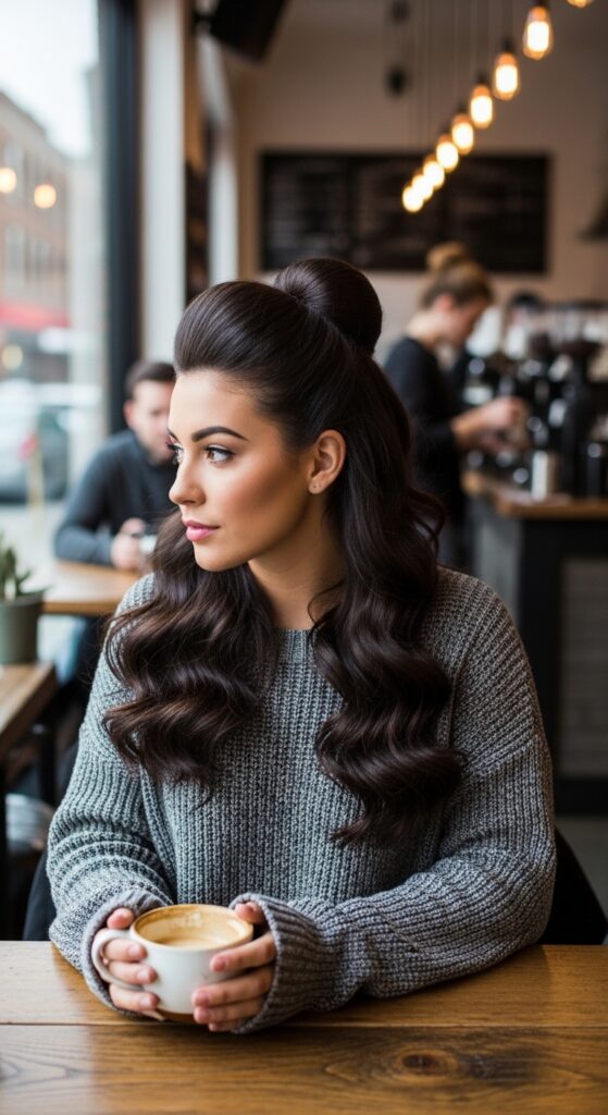 Use a satin scrunchie to prevent breakage. For a fuller puff, gently tease the hair at your crown. It’s playful, easy, and protects your ends.