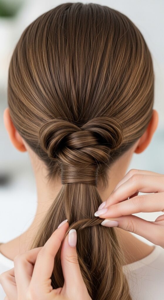 Create a low ponytail first, but don’t pull the hair all the way through on the last loop of the tie. You’ll get a perfect, contained bun base. Then, twist the remaining length and wrap it around.
