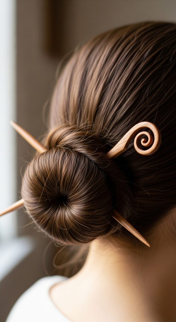 It’s secure, beautiful, and feels special. Choose a stick in wood, tortoiseshell, or metal to match your personal style. It’s a functional piece of jewelry.