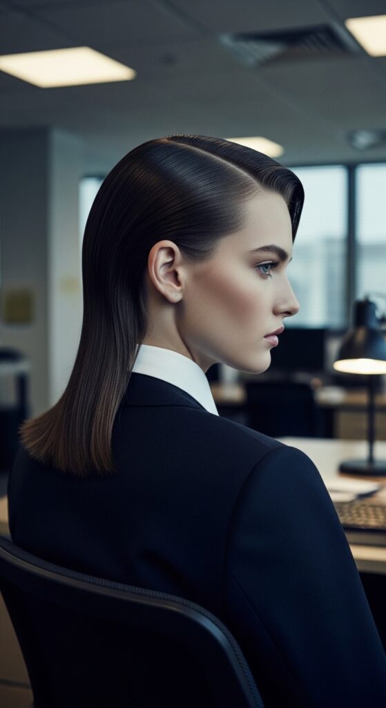 Sometimes, simplicity is the ultimate sophistication. A deep side part with pin-straight hair is a classic power look. It’s severe in the best way, offering a strong, confident silhouette.