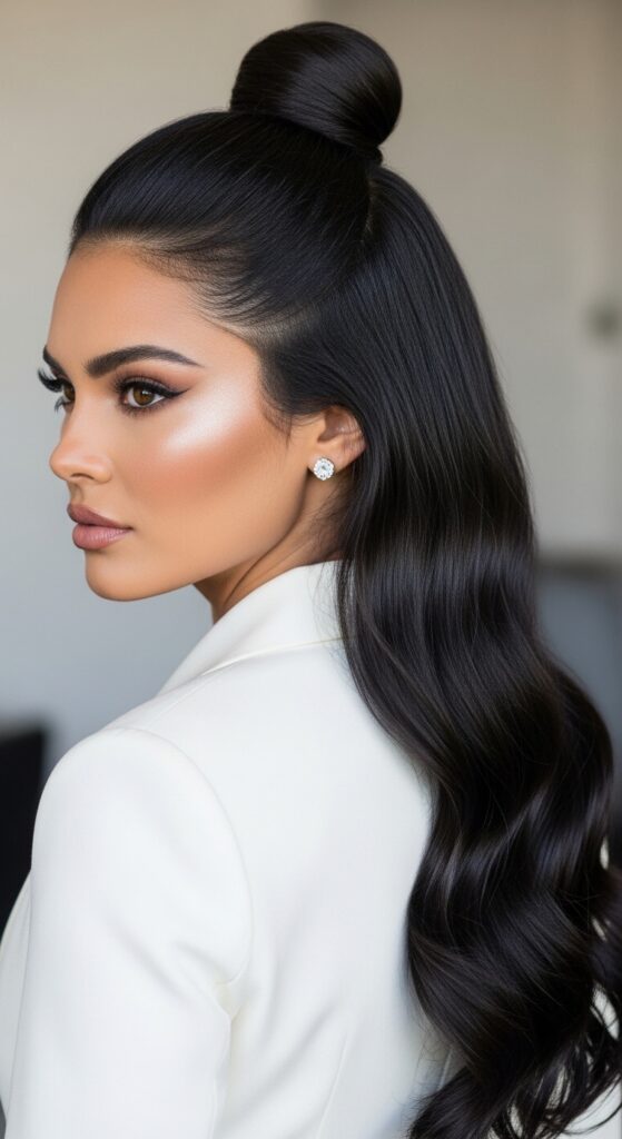 Brush it smoothly and secure it at the back of your crown in a small, tight bun or twist. Leave the rest down in sleek waves or straight. This creates a flattering, lifted effect.